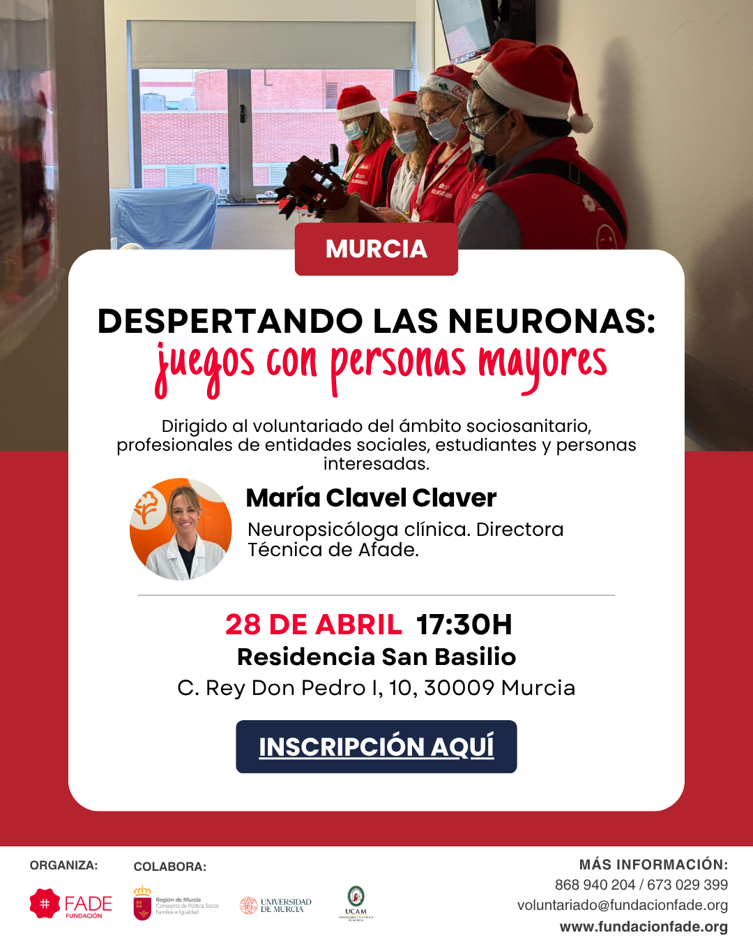- Ponente: María Clavel, Neuropsicóloga clínica. Directora Técnica de Afade, Asociación de Familiares de Enfermos de Alzheimer y otras Demencias de la Región de Murcia